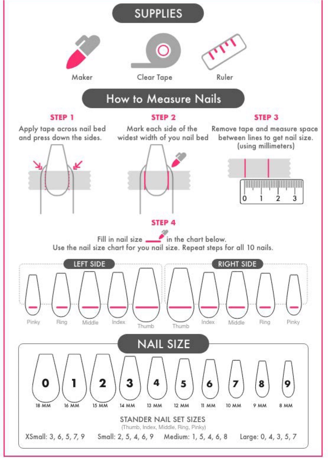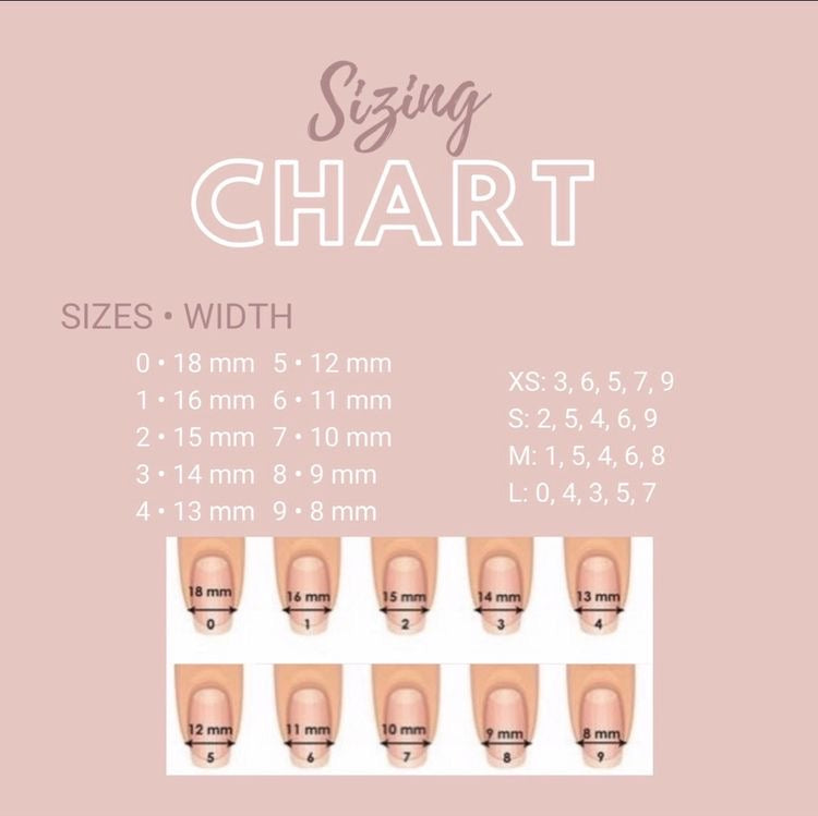 See image to the left to properly size press on nails. Sizing kits are always available for any shape to insure you get the perfect fit!